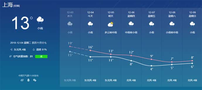 上海中心氣象臺預計,今天上海是陰轉(zhuǎn)多云天氣,明天,在冷空氣的作用下,將出現(xiàn)明顯的大風降溫天氣,降溫幅度可達5℃~7℃,局部地區(qū)有短時小雪。周五早晨最低氣溫將重回0℃冰點,可能會飄起較弱的零星小雪,但形成積雪的可能性不大。本周六和周日,市區(qū)最低氣溫約為-3℃,有冰凍,郊區(qū)可能冷到-6℃~-4℃,并有嚴重冰凍。