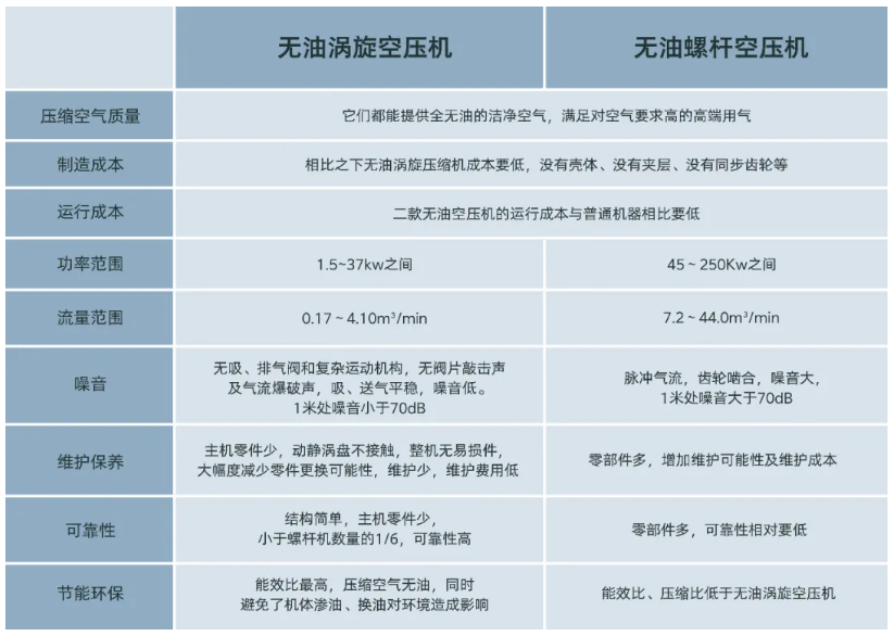 很多用戶想知道無油螺桿空壓機與無油渦旋空壓機的區(qū)分,今天他們來了。兩者之間有很多共同點,又有許多不同之處,下面我們通過工作原理、詳細對比數(shù)據(jù)、優(yōu)勢及應(yīng)用場景等幾個方面進行對比區(qū)別。