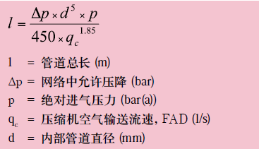 管道網(wǎng)絡(luò)中特定壓降,最長(zhǎng)的允許長(zhǎng)度可以使用下列計(jì)算公式,薩震節(jié)能空壓機(jī)與您一起計(jì)算下: